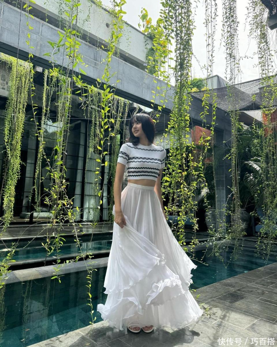 身穿黑白印花款针织T恤的Lisa端庄又精致,搭配纯白色高腰百褶裙,仙美灵动,层层叠叠的裙摆设计,唯美又浪漫,定格在镜头中的效果贼有吸引力。